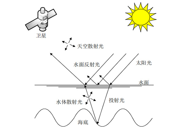 自然界中的全部物質都具有光譜特征,不同物質的光譜特性不同,光譜的差異與物質的差異呈正相關。海洋水質遙感監測的原理是根據純凈水體和其他水體具有不同的光譜特性,在衛星上搭載傳感器接收一定波長范圍內的輻射值,分析水質參數對特定波長的光的吸收和散射情況,結合光譜和水質參數濃度的數學關系,最終反演出各種水質參數的濃度值。如下圖所示,衛星遙感監測時衛星上的傳感器接收到三部分的太陽輻射: